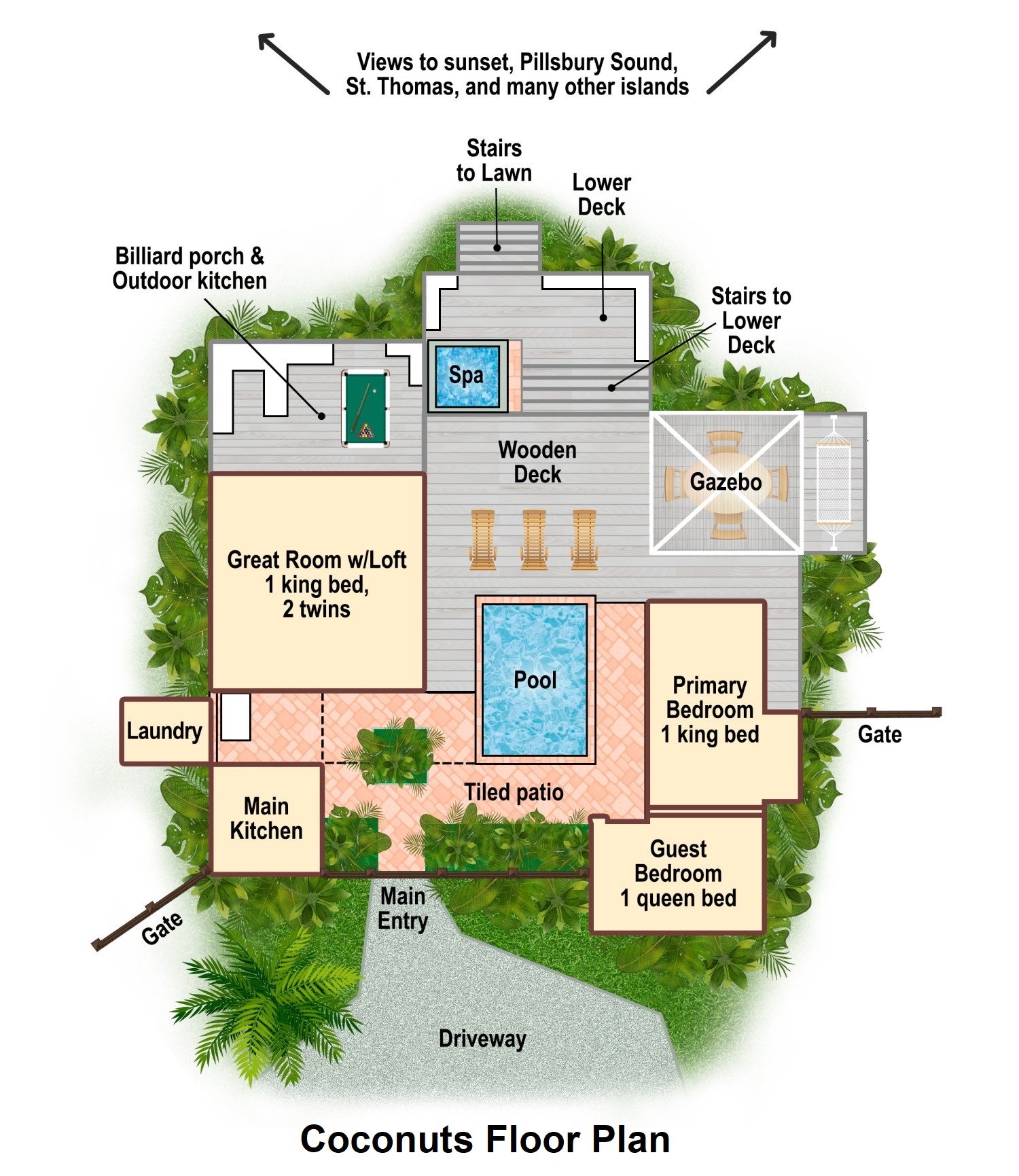 Coconuts single-level floor plan consists of four hip-roofed buildings (indoor kitchen, great room, primary bedroom, and guest bedroom), arranged in a "U" around the solar heated pool and interior courtyard, with decks, covered walkways, patio gardens, outdoor kitchen, billiard porch, gazebo, and spa facing spectacular views to the west. A detailed floor plan is available in our Photo Gallery (below).